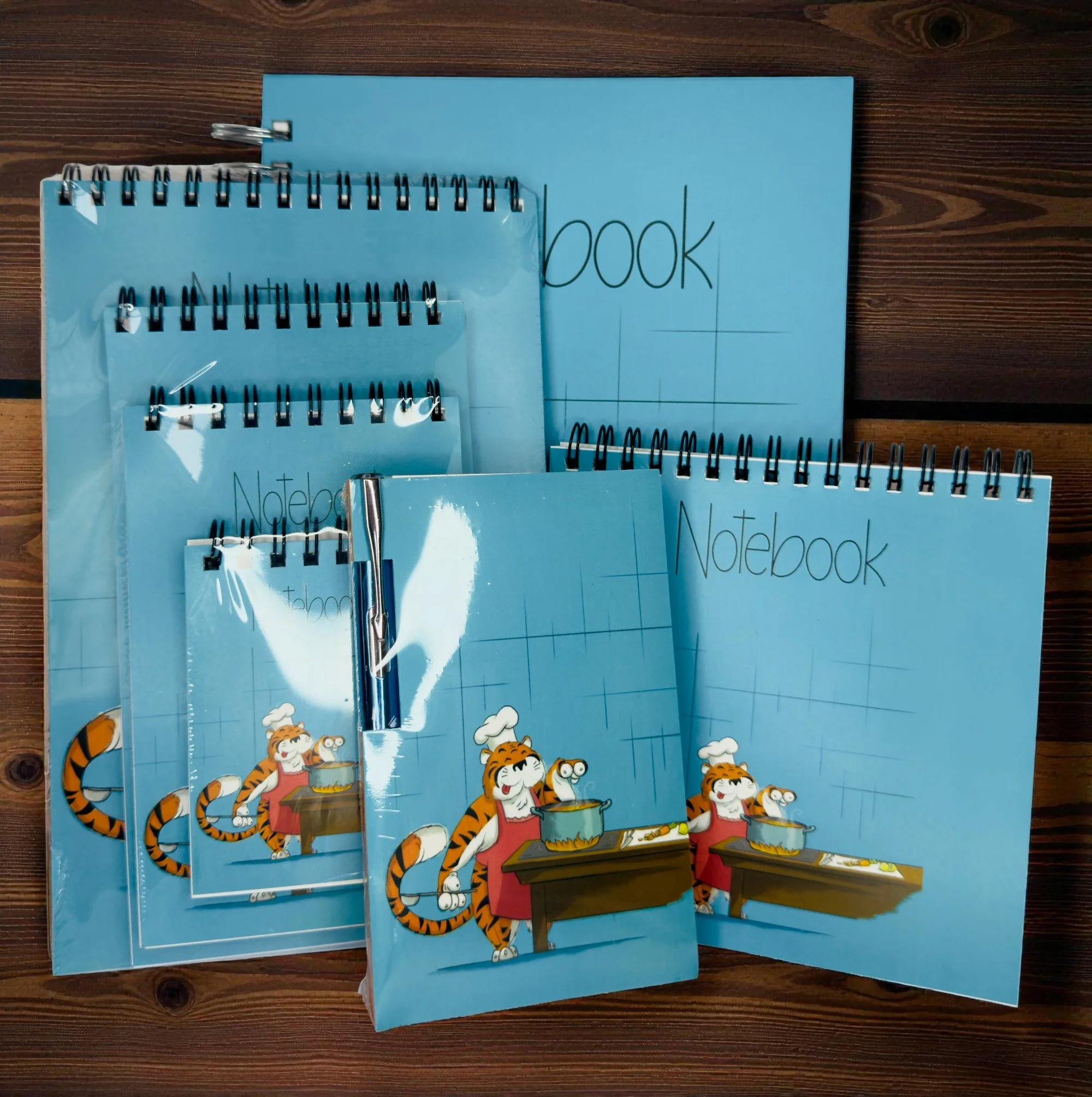 A fun, vibrant set showcasing a cooking-themed blue tiger—great for recipe notes, creative planning, or everyday writing.